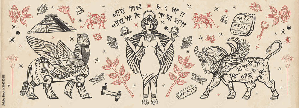 Ancient Sumerian Civilization Old School Tattoo Collection Assyrian Culture Gilgamesh Legends Middle East History Mesopotamian Goddess Ishtar And Lamassu Cuneiform Writing Ziggurat Stock Vector Adobe Stock